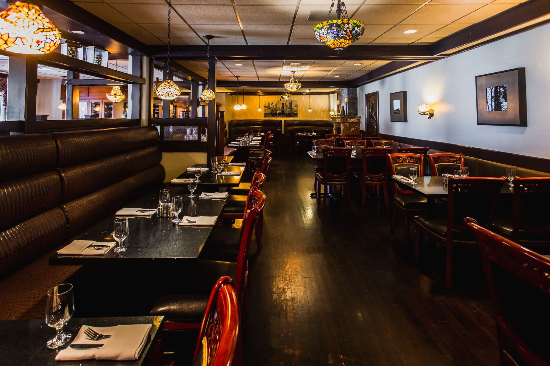 Our main dining room featuring a large fireplace can accommodate groups up to 50.
